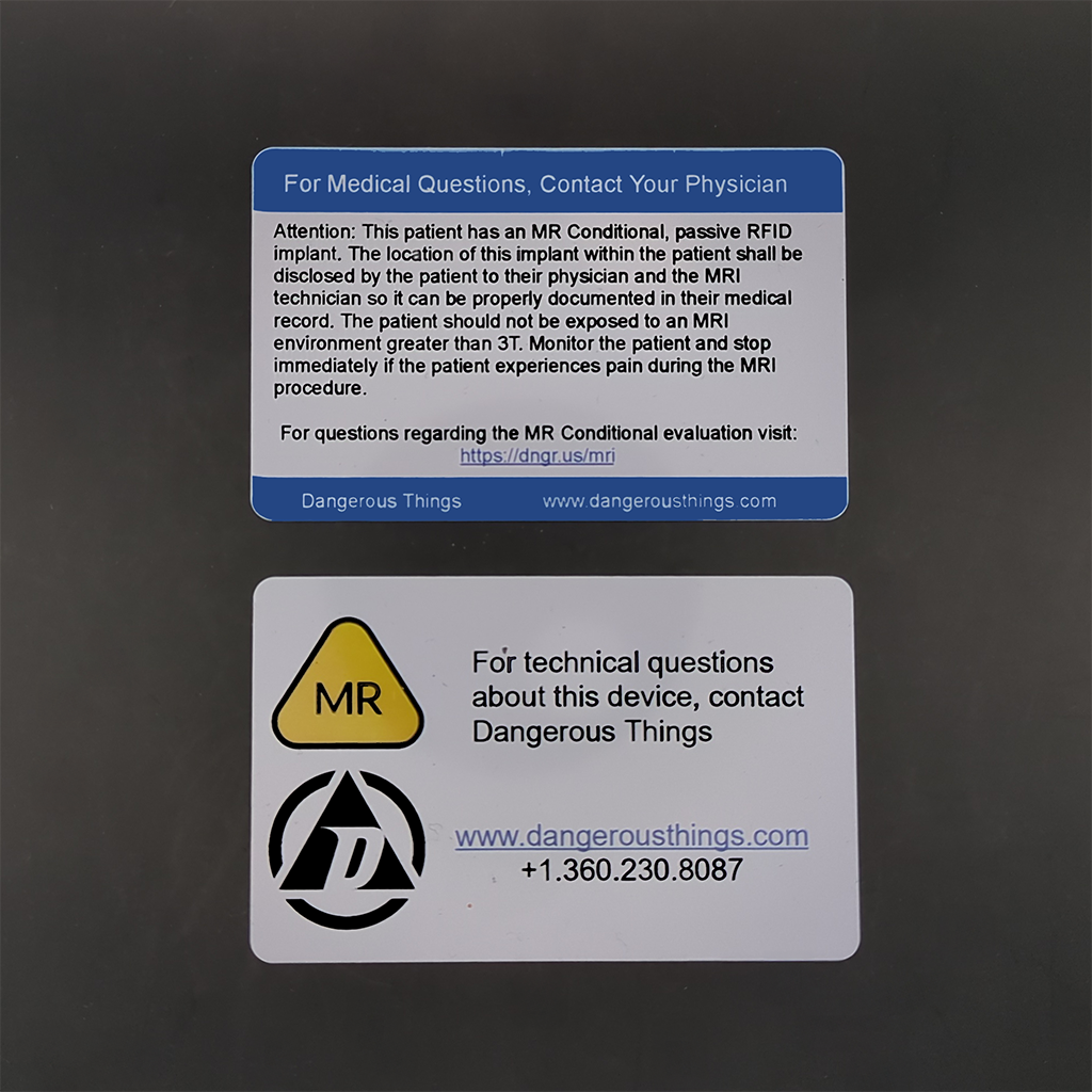 While we include MR cards with relevant products for free, we have had requests for a version that has NFC. These are NTAG213s with an NDEF record set to: https://dngr.us/mri with the same graphics and text. Currently we are offering the Dangerous Things x-Series card. Interested in one for magnets or the VivoKey Sparks? Feel free to reach out on our forum.